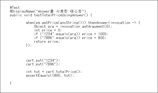 모의 객체를 Stubbing 할 때 특정 값으로 반환하는 대신 메서드 인자 값에 따라 반환 값을 결정할 때 사용(하나의 when으로 여러 리턴 값 설정)